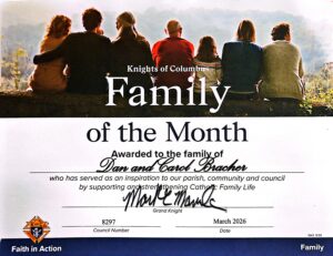 Our Family of the Month is Dan and Carol Bracher, both of whom are heavily involved in virtually all of our Parish activity. Dan, who leads by example, is a Eucharistic Minister and leads the weekly before-Mass Rosary, and recently took on a major endeavor to catch up the long overdue Parish facility maintenance needs. Carol is involved with Legion of Mary and is also ever-present when volunteers are needed for virtually anything going on at the Parish. We thank them for all they do for our Parish community!