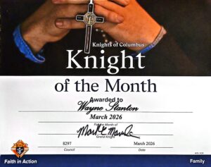 Brother Wayne Stanton is our Knight of the Month. Brother Wayne has been ever-present since he joined us a few months ago. You will find him helping with Coffee and Donuts, Pancake Breakfasts, and our St. Patrick’s Dinner. He has regularly provided great insight for our upcoming projects at our regular Membership Meetings. We value his enthusiastic participation and look forward to his wonderful inspiration for all. Thank you Brother Wayne, for all you do, especially in service to our country as a member of the US Navy at Trident Refit Facility!