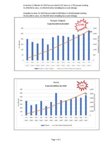 Inception to date, KC HELP has provided 15,804 items to 8,426 people totaling $4,621,360 in value, $5,339,039 when including hours and mileage.