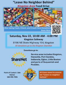 Our Council will have a Food Drive on November 22nd at the Kingston Safeway from 10 AM until 4 PM to support ShareNet in Kingston. We hope to pack our KC HELP trailer and will need at least 4 people for each of three 2-hour shifts.