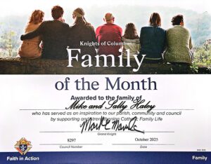 The Mike and Sally Haley family is our Family of the Month. Brother Mike one of 4 remaining Charter Members of our Council, has recently taken on the role of President of our local St. Vincent de Paul Conference and he and Sally are leading the OCIA program for our Parish where they are instructing 12 new-to-be Catholics. Thank you Mike and Sally for all you do for our Council and our Parish!