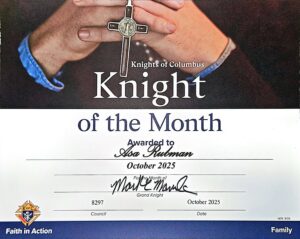 Brother Asa Rubman is our Knight of the Month. Brother Asa is one of our very newest members and he has enthusiastically taken on a new initiative for our Council to enjoin the young families of our members in various faith-based activities. Near-term, he is coordinating a Keep Christ in Christmas Essay Contest and Christmas Caroling and Cookie decorating event. Stay tuned for details. Thank you, Brother Asa for your proactive and passionate support for the young families of our Council and our Parish!